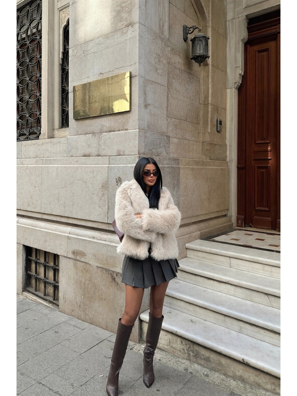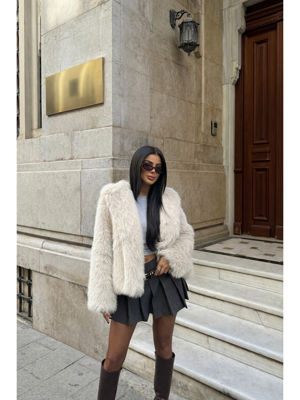 Tato krémová kožešinová bunda vyniká svým hebkým povrchem a světlým odstínem, který dodává outfitu lehkost a sofistikovaný nádech. Kratší střih krásně zvýrazňuje siluetu a umožňuje snadné kombinování s Elegantnými šaty, sukněmi i ležérními městskými outfity.
