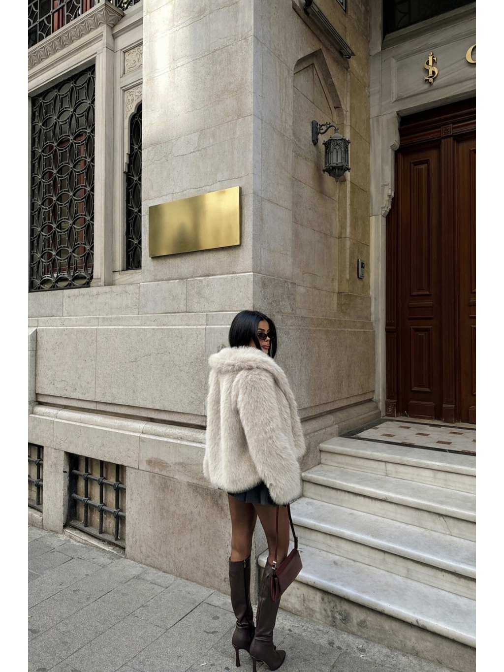 Krémová kožešinová bunda s jemným objemem a Elegantným vzhledem, která působí luxusně a nadčasově.