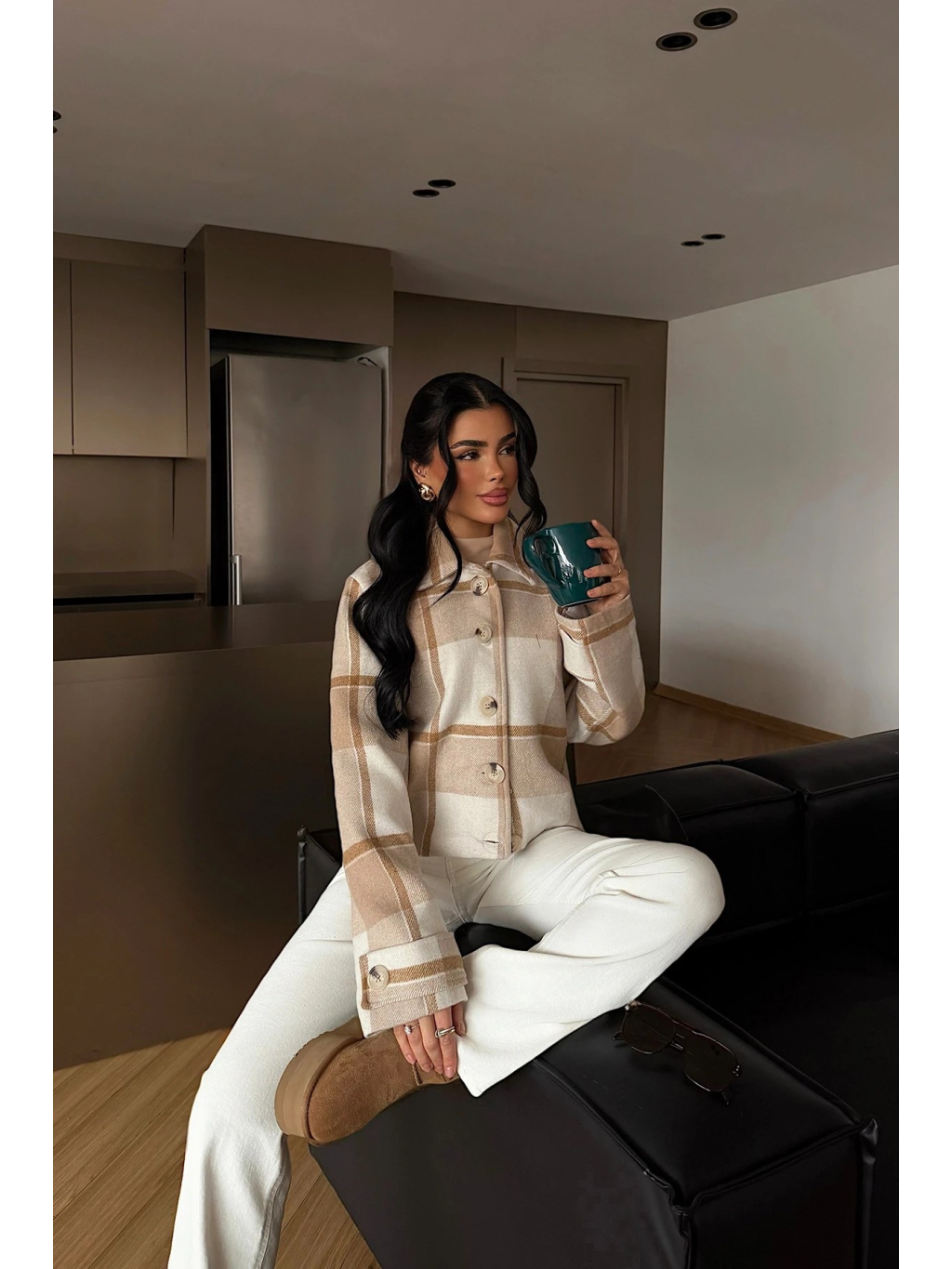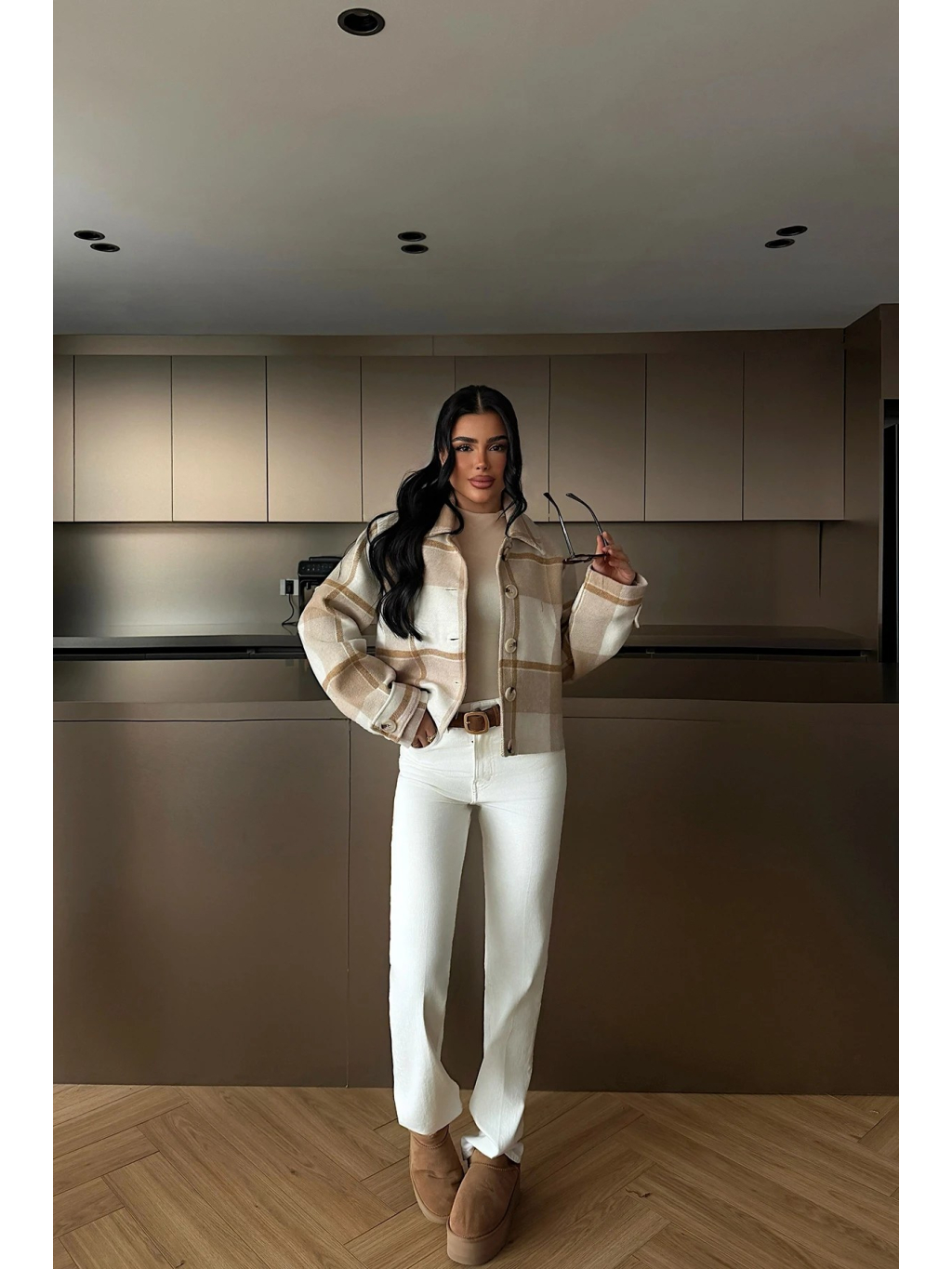 Táto béžová kockovaná bunda vyniká čistým, nadčasovým dizajnom a kratším, mierne štruktúrovaným strihom, ktorý krásne doplní elegantné aj ležérne outfity. Jemná kocka v kombinácii béžových a krémových tónov pôsobí sofistikovane a ľahko sa kombinuje s nohavicami, rifľami aj šatami.