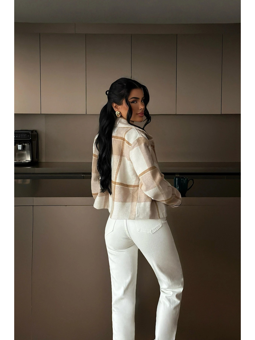Štýlová béžová kockovaná bunda s kratším strihom, ideálna na vrstvenie a elegantný každodenný outfit.
