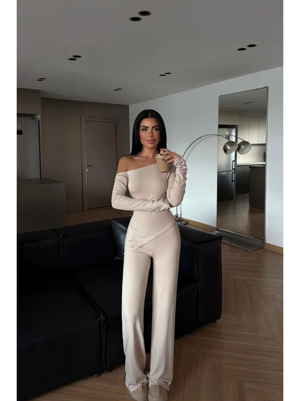 Tento štýlový béžový komplet predstavuje perfektné spojenie pohodlia a modernej elegancie. Skladá sa z asymetrického topu na jedno rameno a voľných dlhých nohavíc, ktoré vytvárajú čistý a sofistikovaný look.