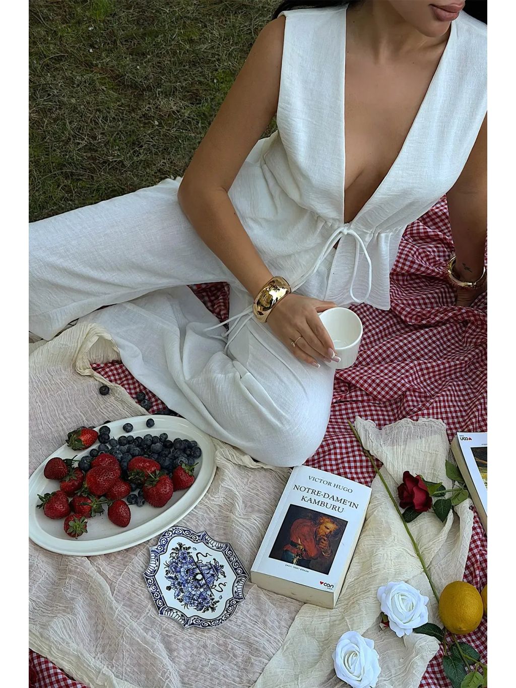 Tento vzdušný biely komplet je perfektnou kombináciou pohodlia a ženskej elegancie. Skladá sa z jemne priliehavého topu s hlbším výstrihom a zaväzovaním v páse, ktorý krásne zvýrazní siluetu, a voľných dlhých nohavíc, ktoré pôsobia uvoľnene a štýlovo zároveň.