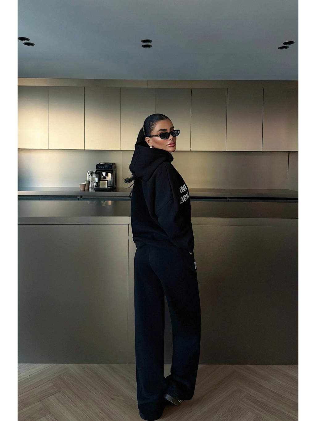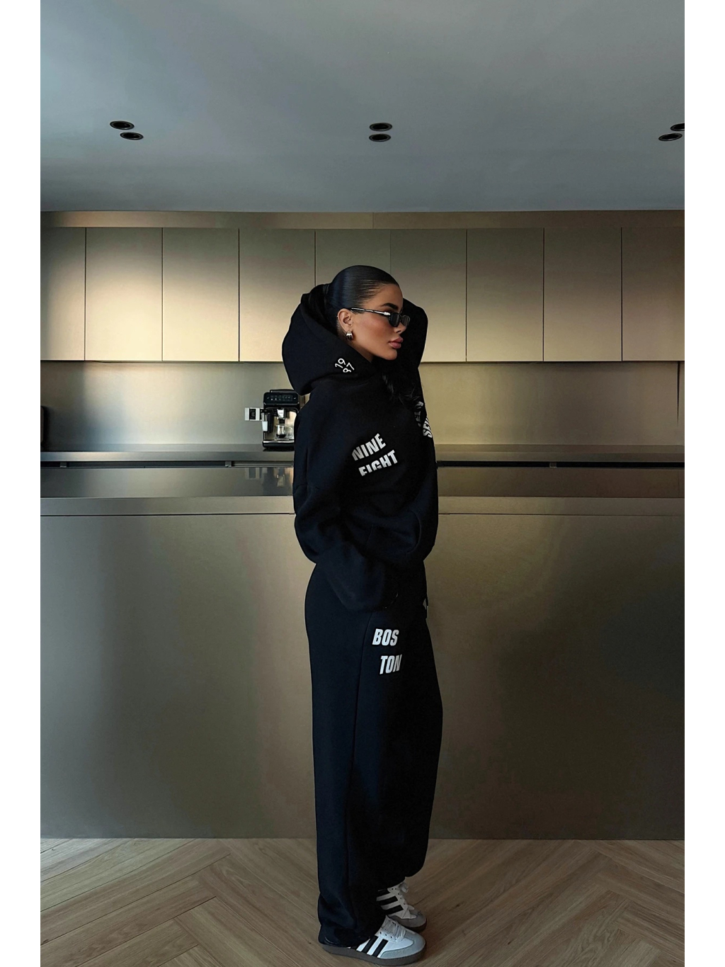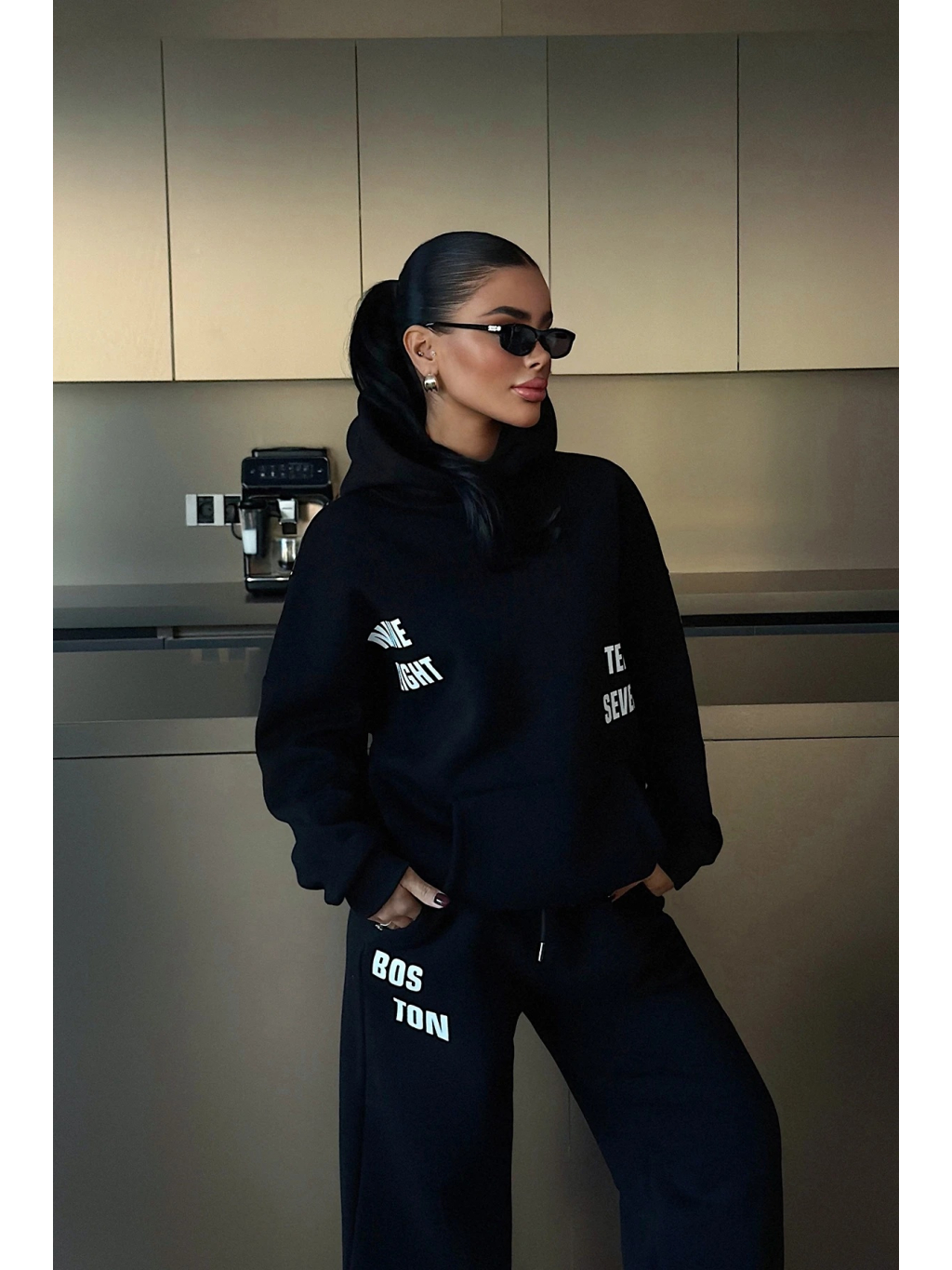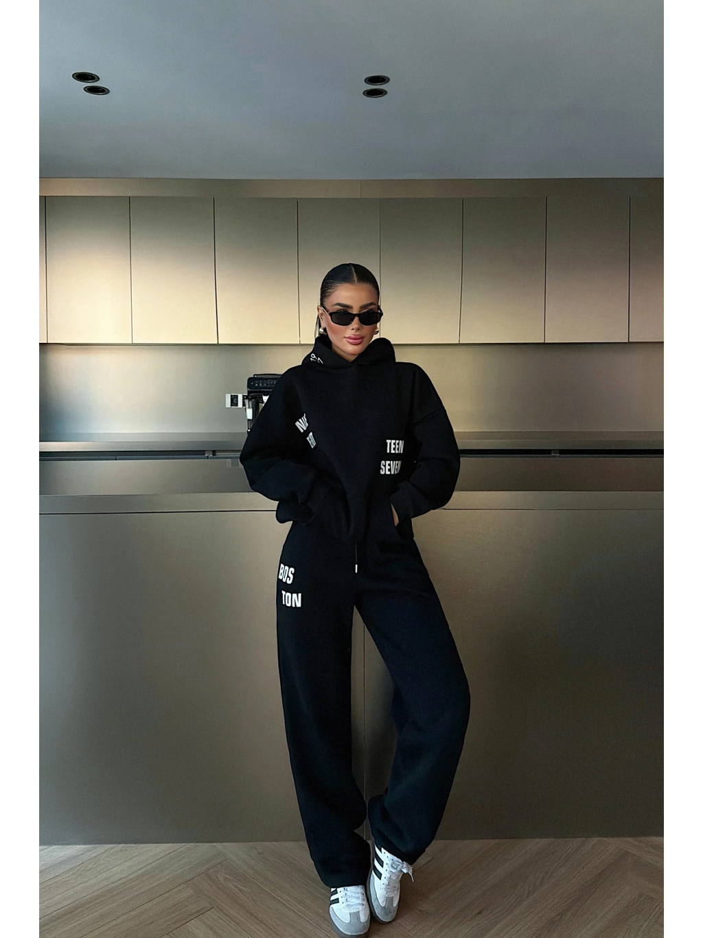 Tento černý teplákový set v oversized střihu spojuje maximální pohodlí a trendový městský styl. Mikina má kapuci s potiskem, spadlá ramena a prodloužené rukávy pro uvolněný vibe. Tepláky jsou rovného střihu s elastickým pasem a praktickými kapsami, doplněné výraznými potisky s nápisy BOSTON.