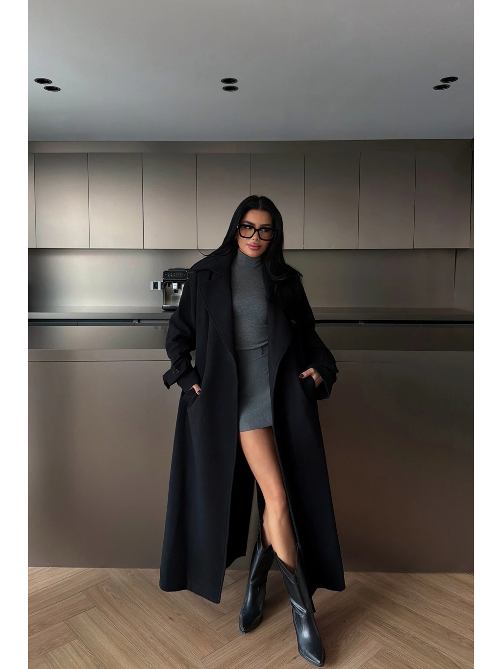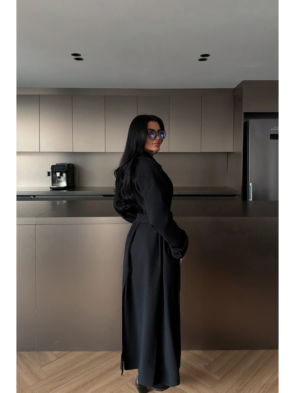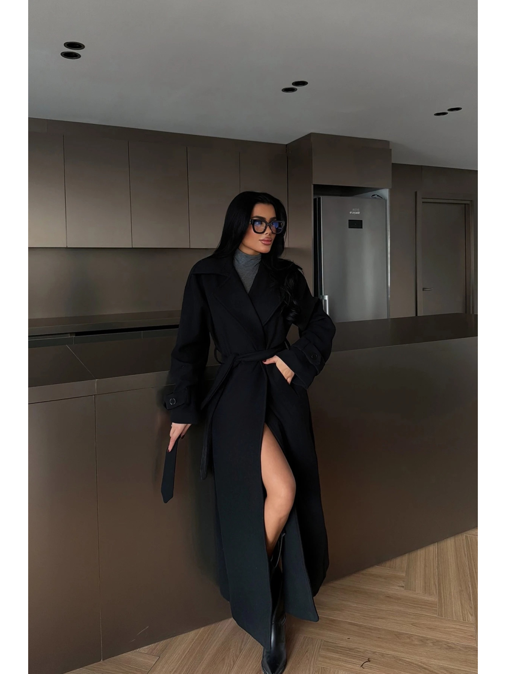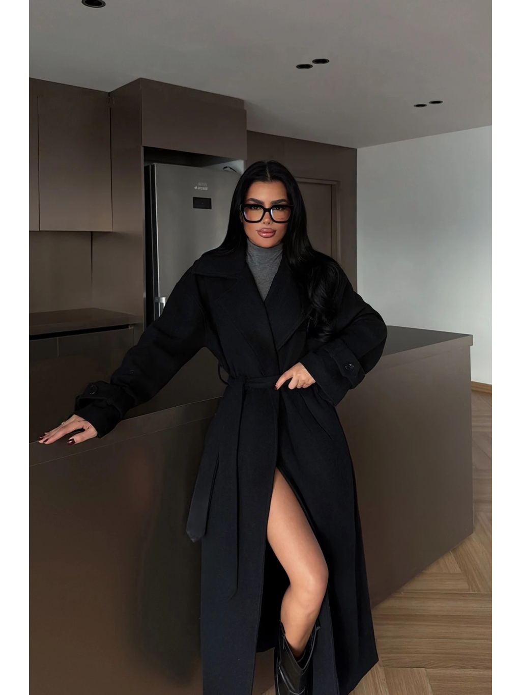 Čierne provedení je univerzální a snadno kombinovatelné – skvěle funguje s monochromatickými outfity i kontrastními barvami. Kabát lze nosit volně rozevřený pro ležérní look, nebo stažený v pase pro výraznější tvar.