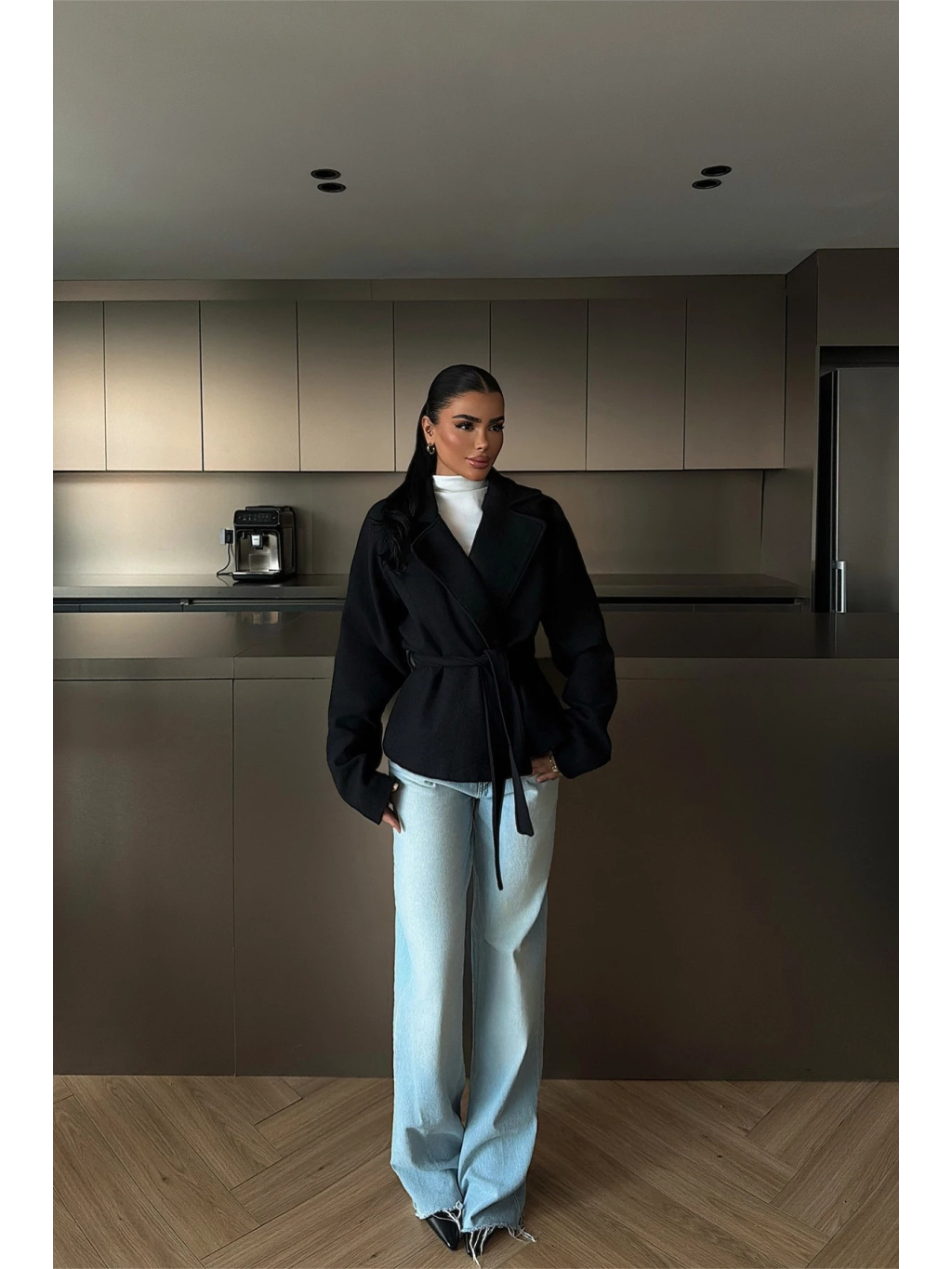 Elegantný černý krátký kabát s páskem v pase, nadčasový kousek pro čistý a sofistikovaný outfit.