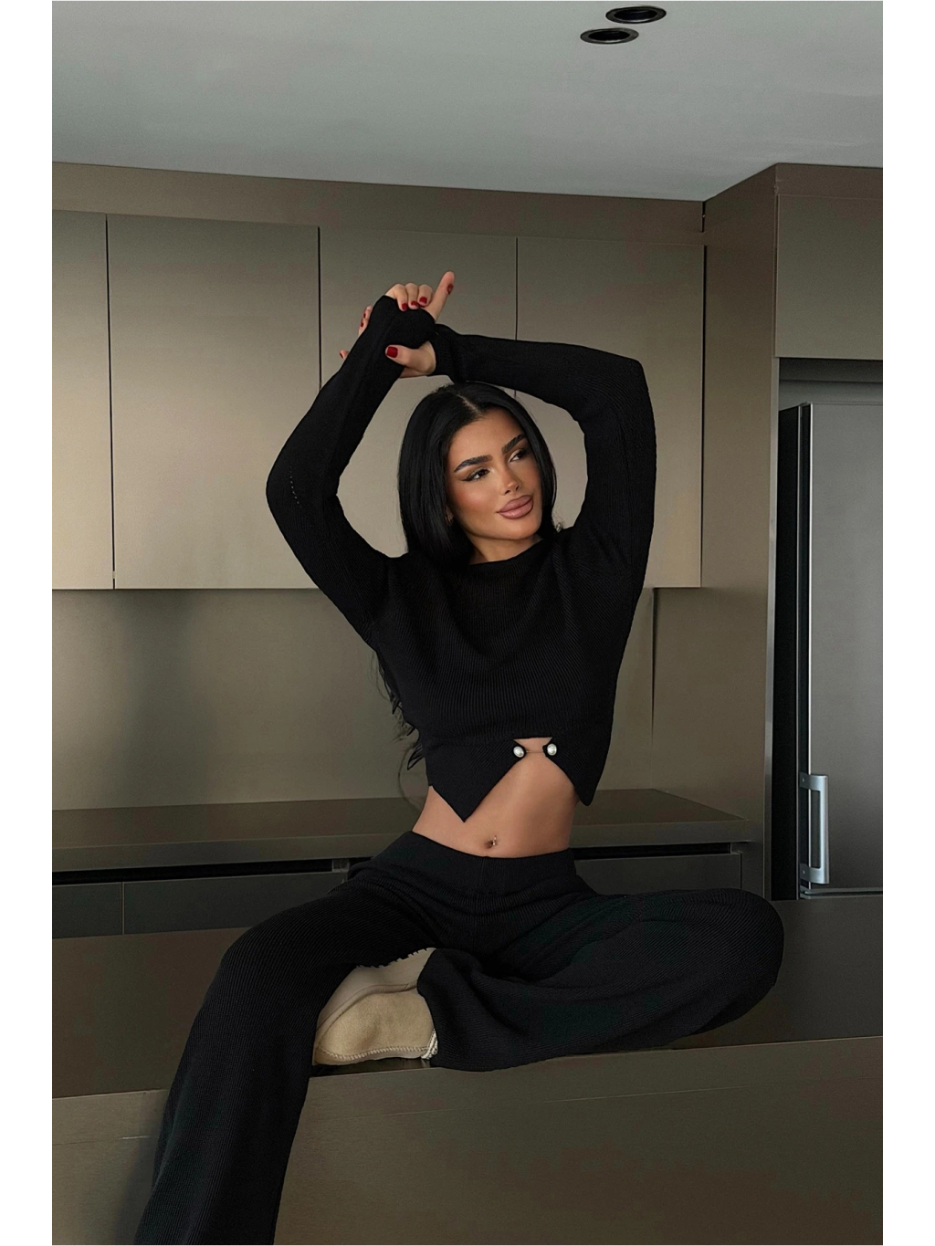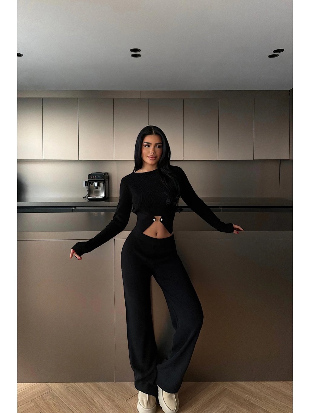 Černý pletený set s dlouhým topem a kalhotami, doplněný výrazným detailem zapínání v pase.