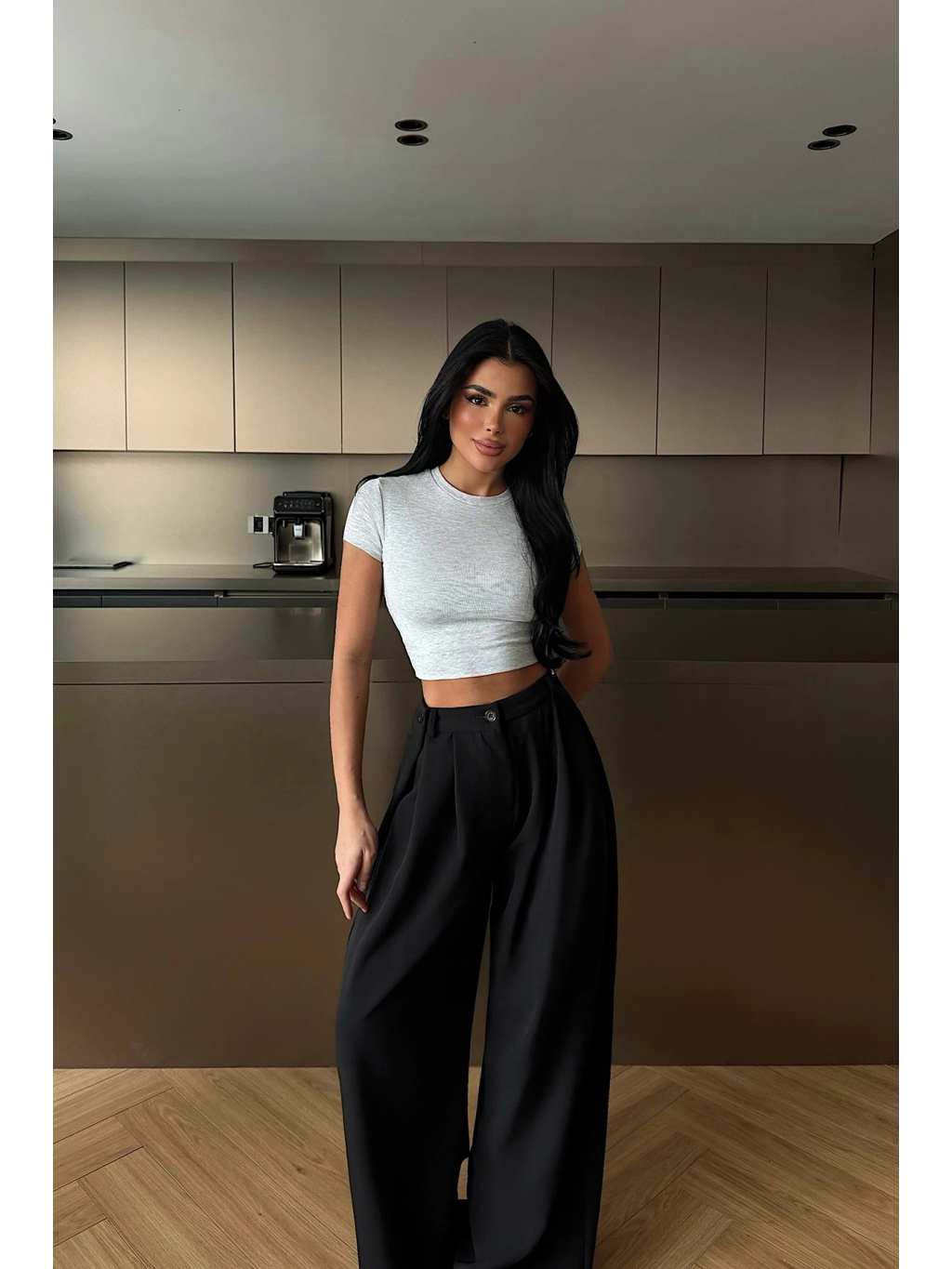 Nadčasové čierne nohavice s vysokým pásom a širokými nohavicami pre elegantný a sebavedomý vzhľad.