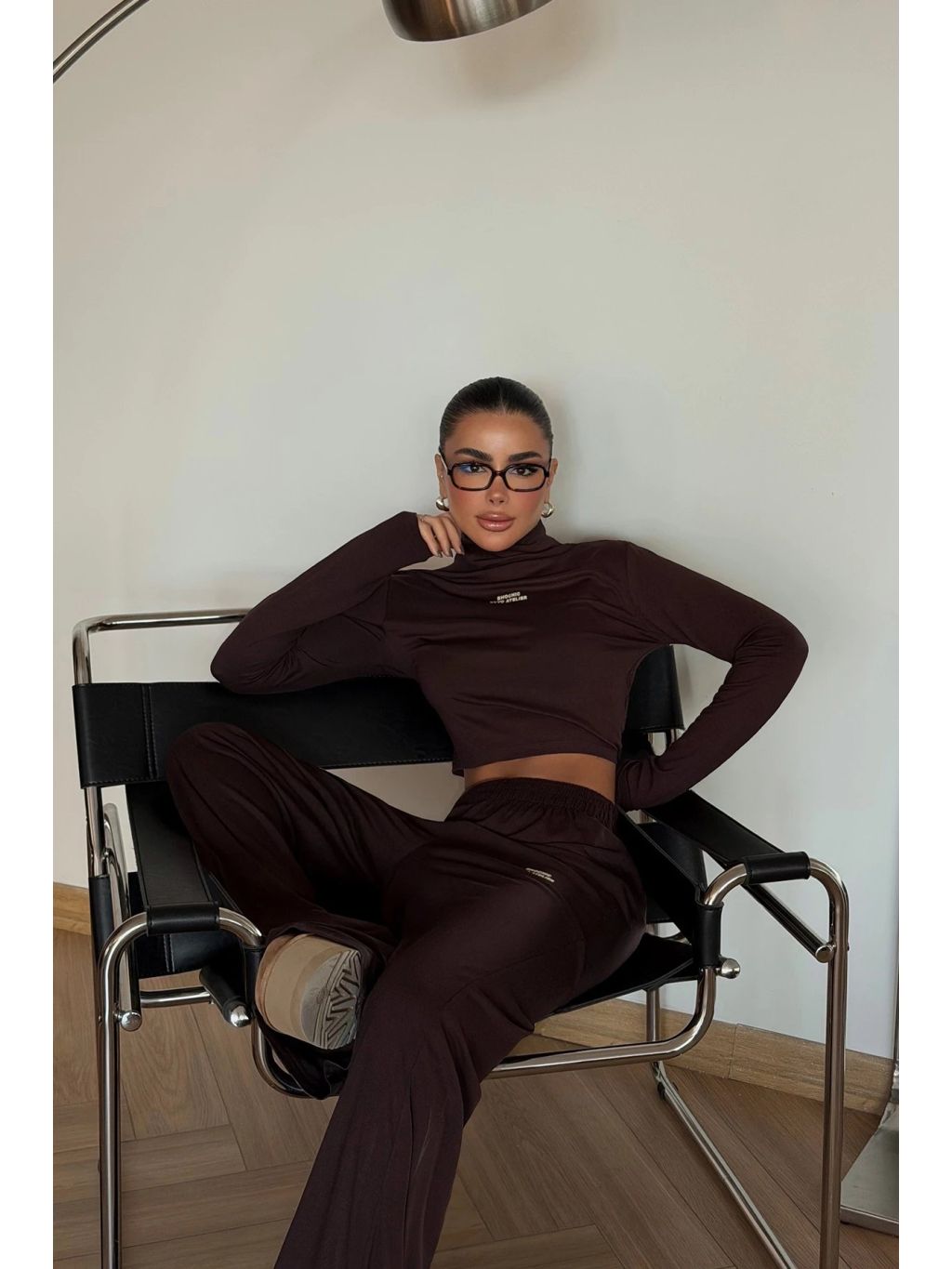 Hnedý minimalistický set s dlhým topom a voľnými nohavicami – pohodlný a moderný outfit na každý deň.