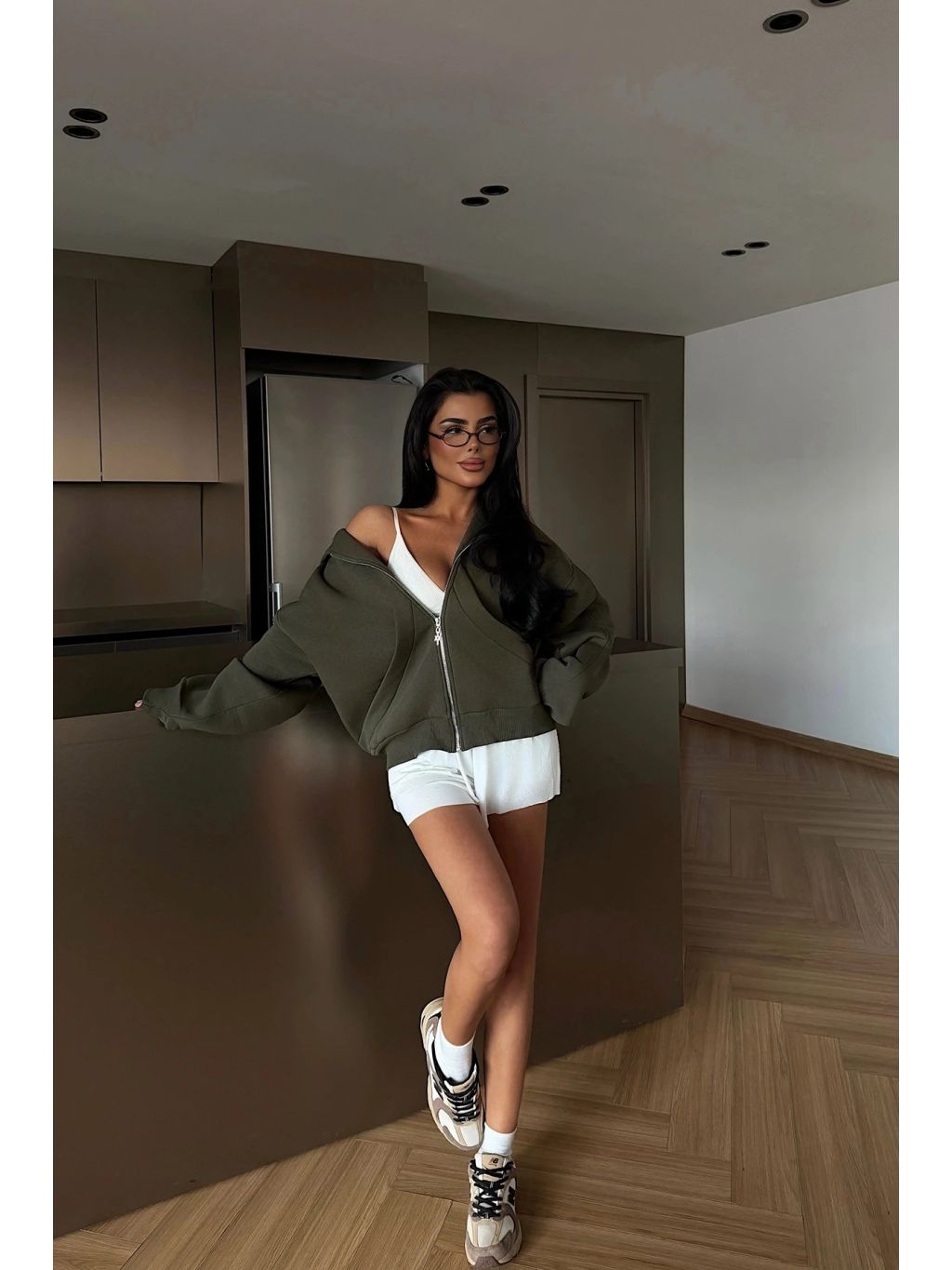 Khaki kardigan s kapucňou a zipsom v modernom, mierne oversized strihu – pohodlný streetový look.