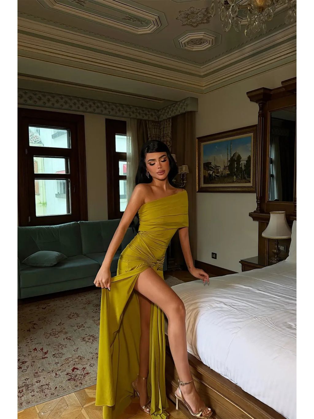 Tieto dlhé šaty v trendy olivovej farbe pôsobia maximálne elegantne a nadčasovo. Asymetrický strih na jedno rameno zvýrazňuje líniu ramien a dodáva modelu moderný, sofistikovaný vzhľad.