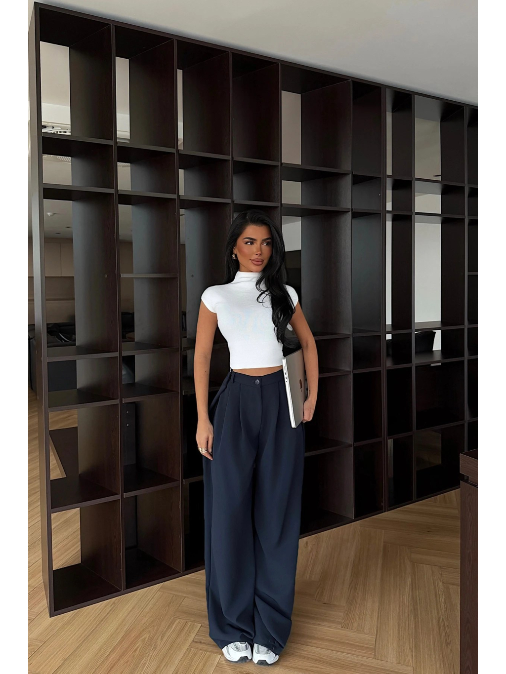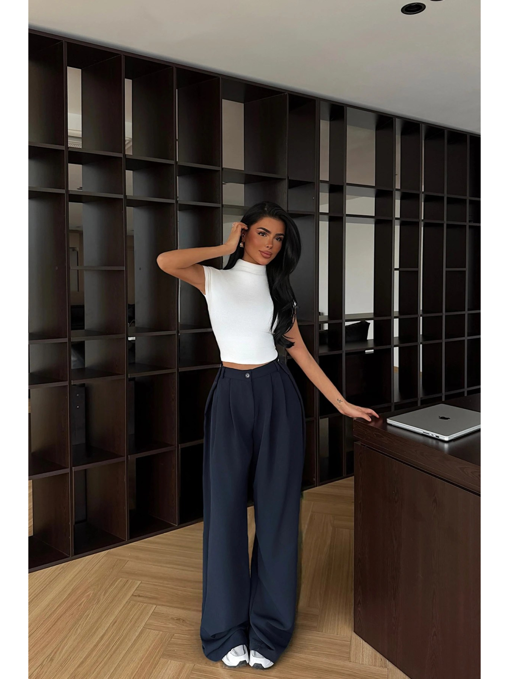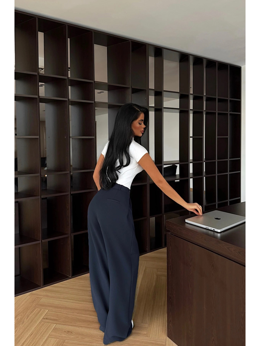 Elegantné tmavomodré nohavice s vysokým pásom a širokými nohavicami pre predĺženú siluetu.