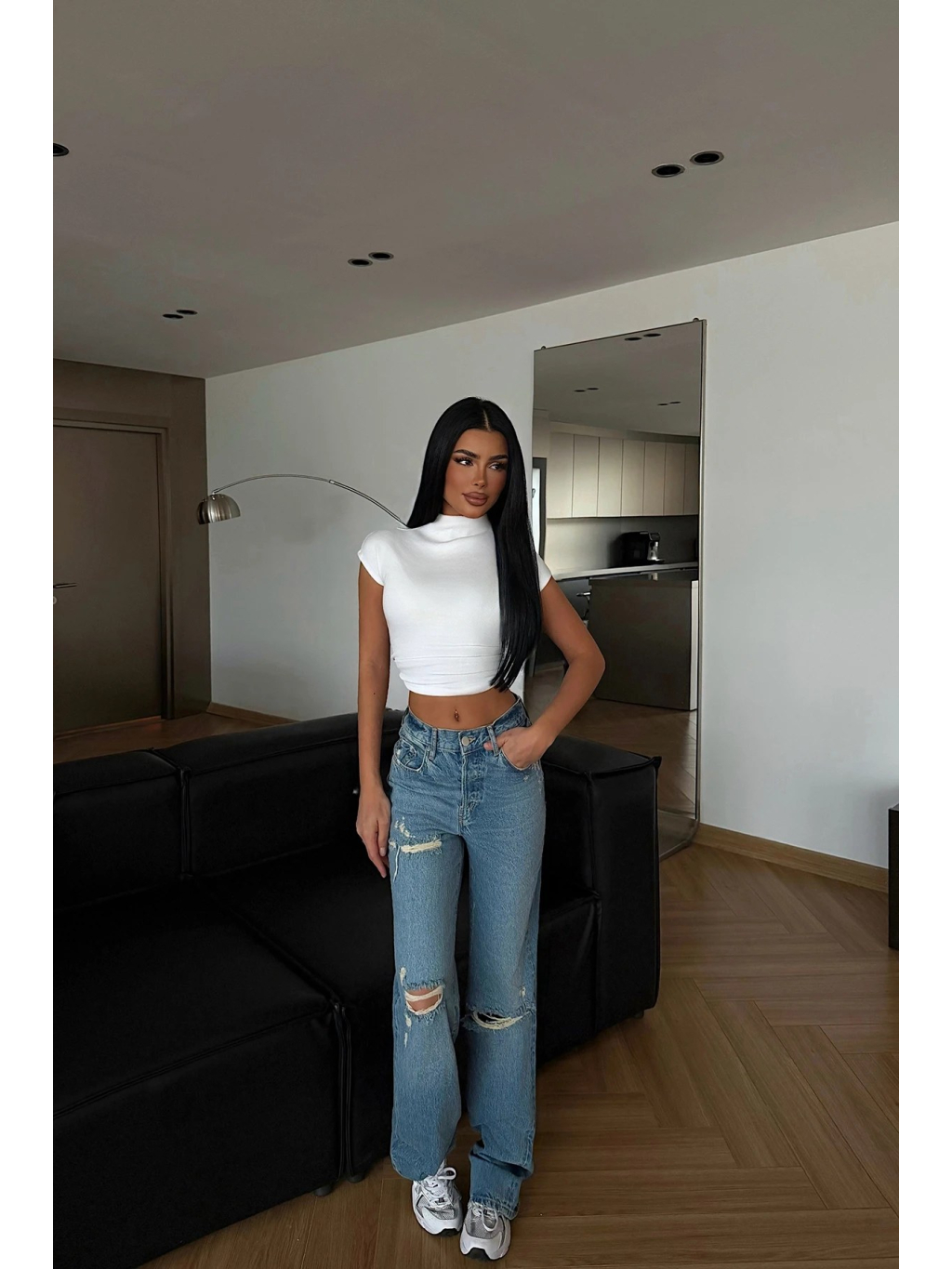 Modré rifle s vysokým pásom a výrazným trhaním – moderný streetový kúsok s charakterom.