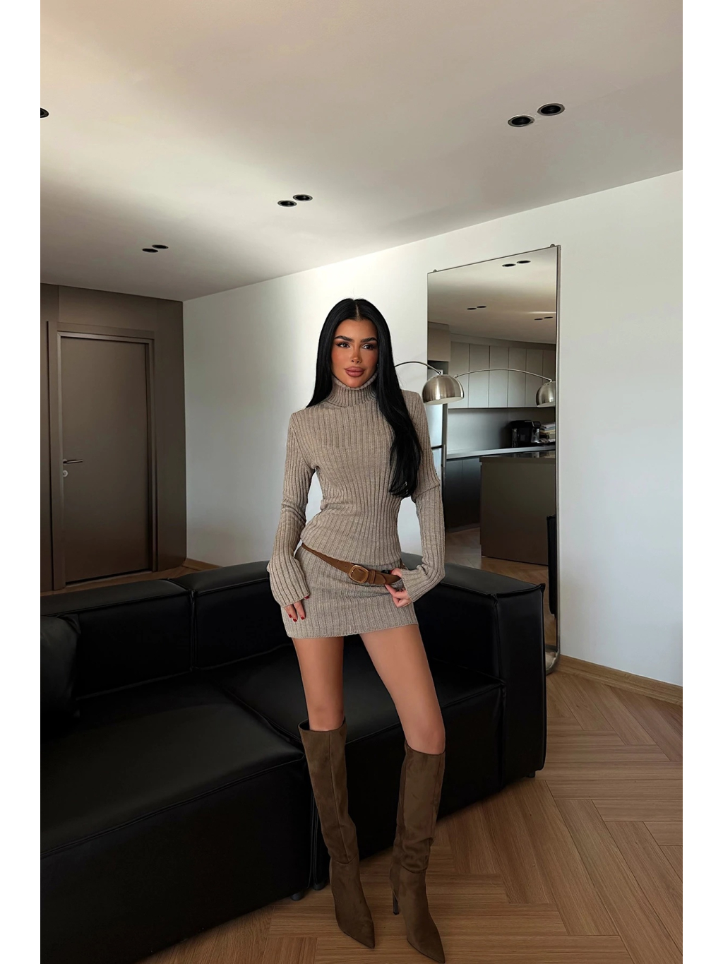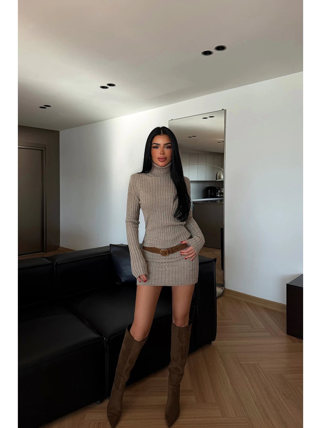 Béžové úpletové šaty s jemným žebrováním a rolákem, které zvýrazní siluetu a působí elegantně i moderně.