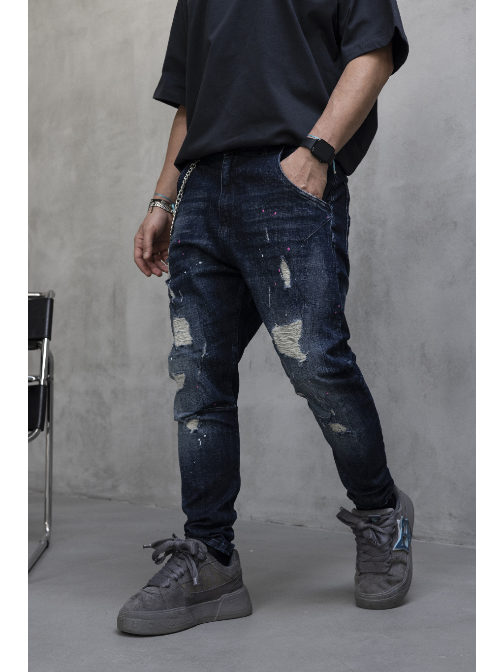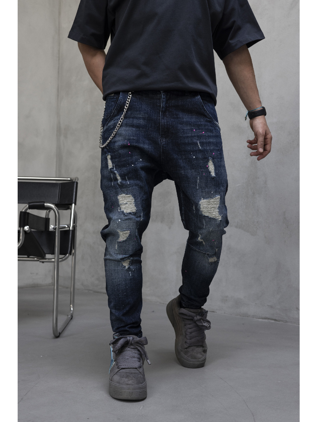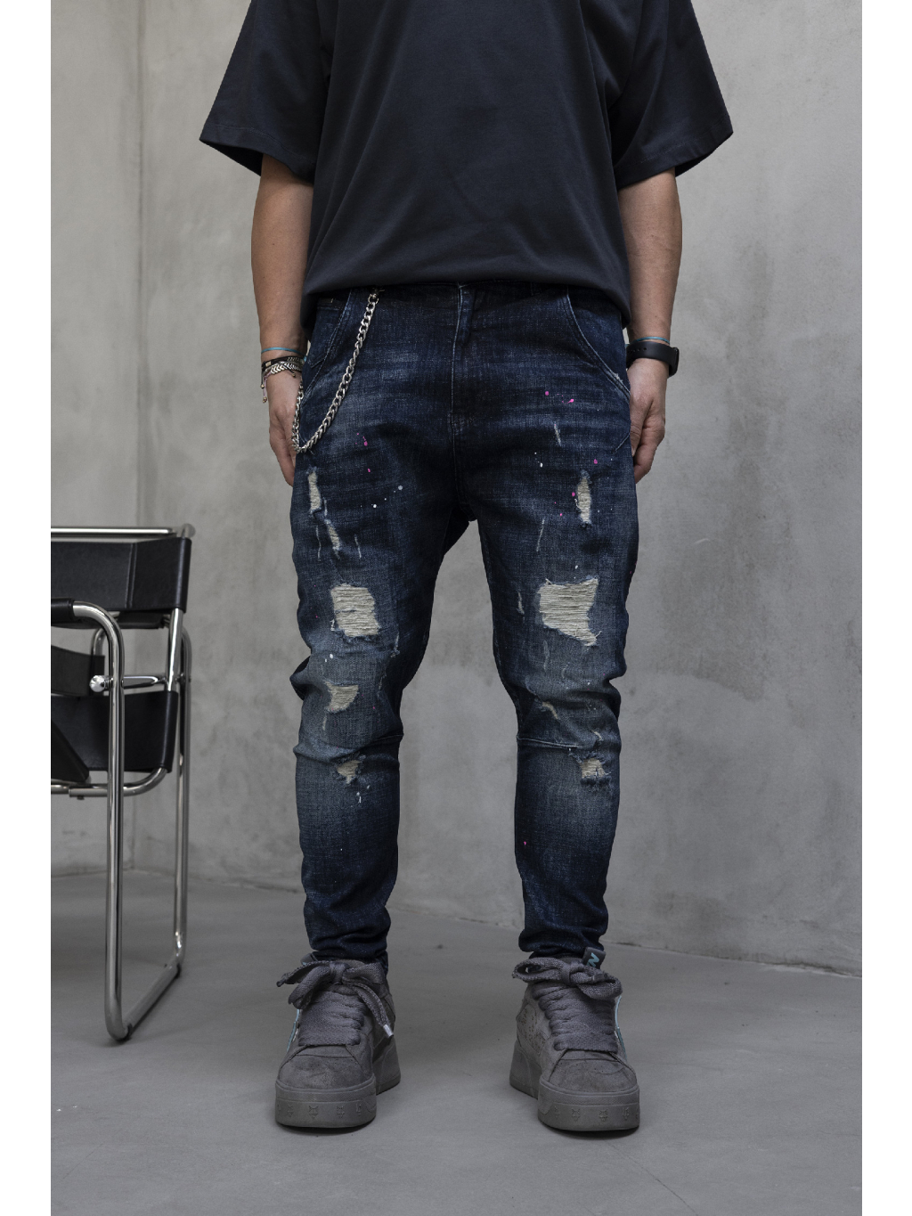 Tmavomodrý denim je doplnený o jemný washed efekt, drobné oderky a distressed detaily, ktoré dodávajú rifliam charakter a ľahko rebelský street vibe. Decentné farebné striekance pôsobia nenápadne, no dodávajú celku originalitu bez zbytočnej okázalosti. Kovová retiazka na boku podčiarkuje urban štýl a pridáva rifliam výrazný detail navyše.