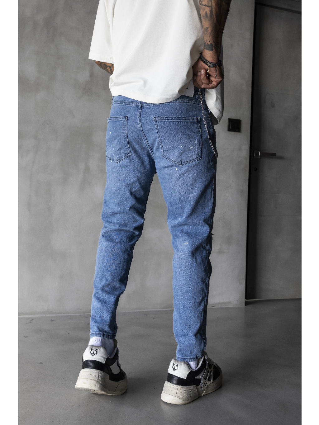 Prednú časť zdobí rozpáraný efekt, menšie trhance a nerovnomerné detaily, ktoré pôsobia moderne a štýlovo. Zadné vrecká majú čistý klasický tvar, jemne doplnený o paint-splat textúry.
