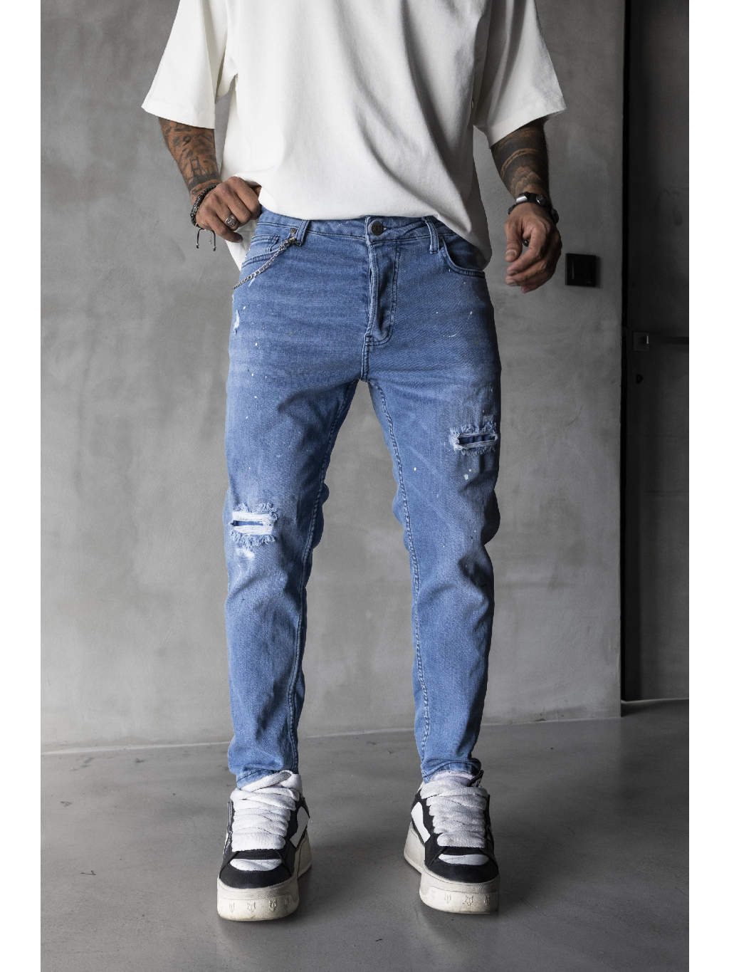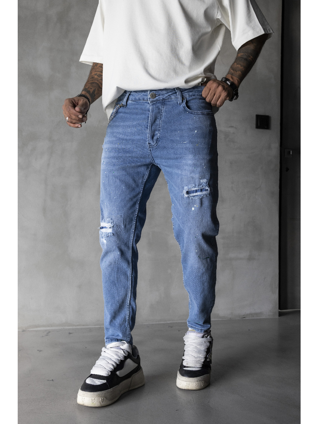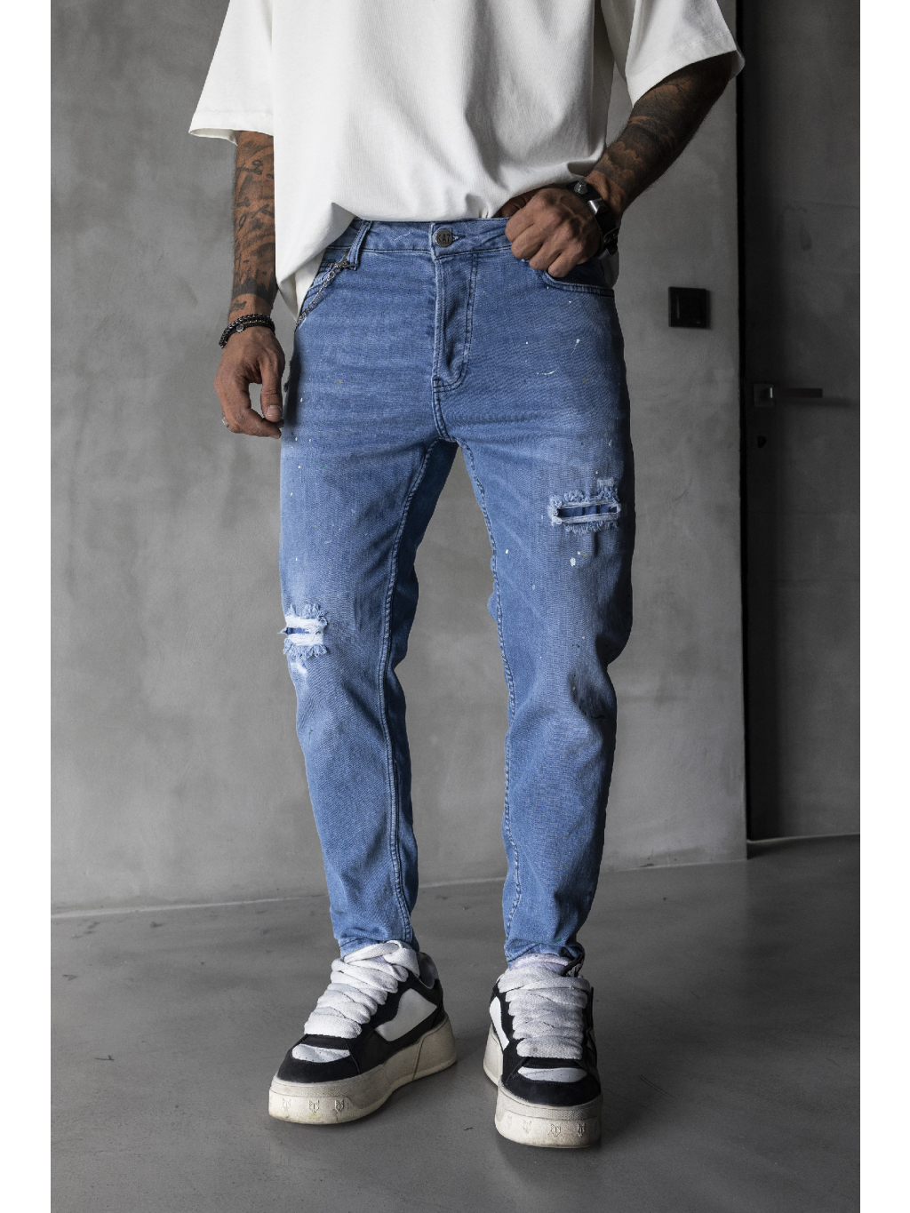 Svetlé slim rifle s jemným destroyed efektom a farebnými paint-splat detailmi pre výrazný streetwear štýl.