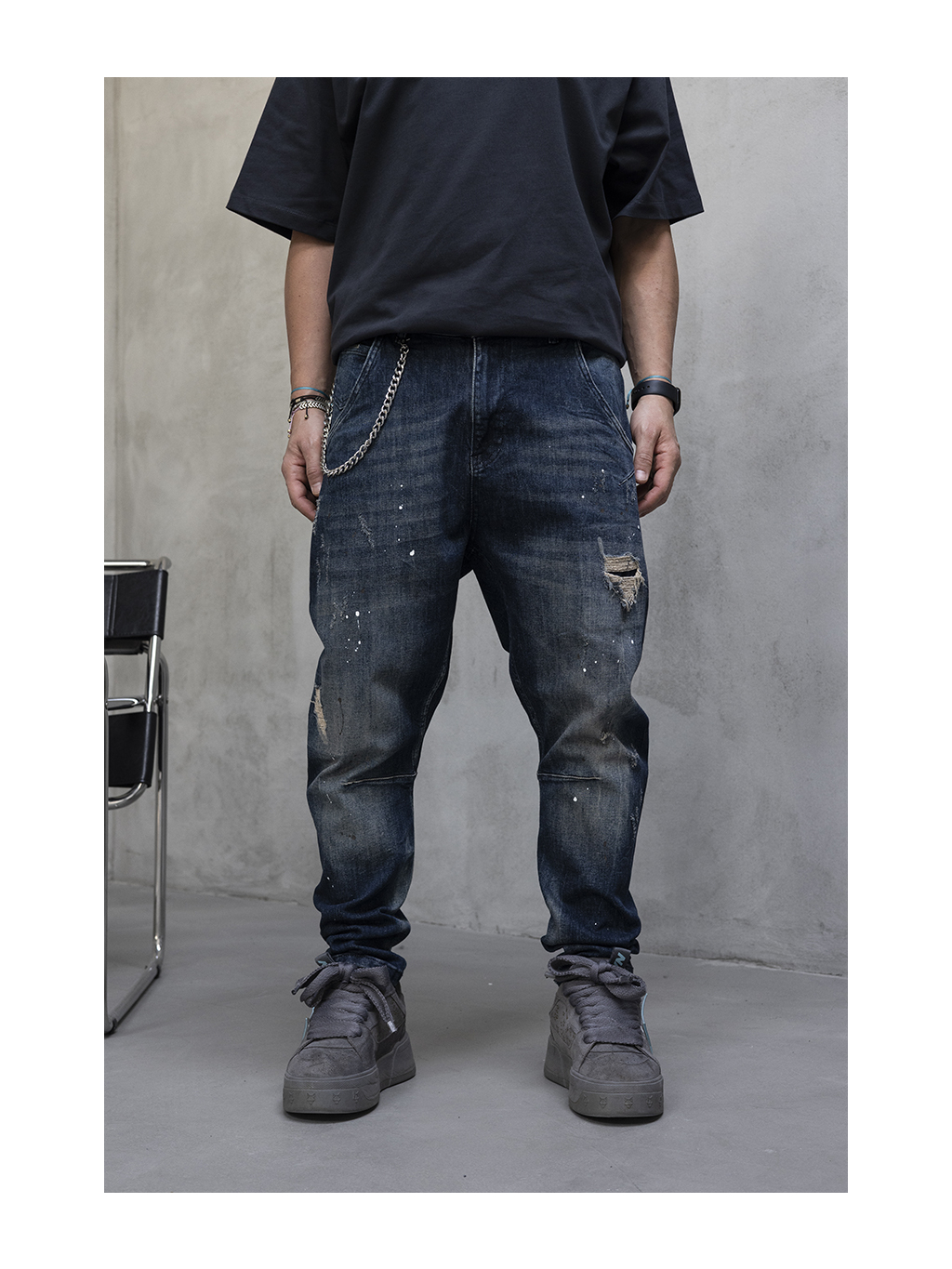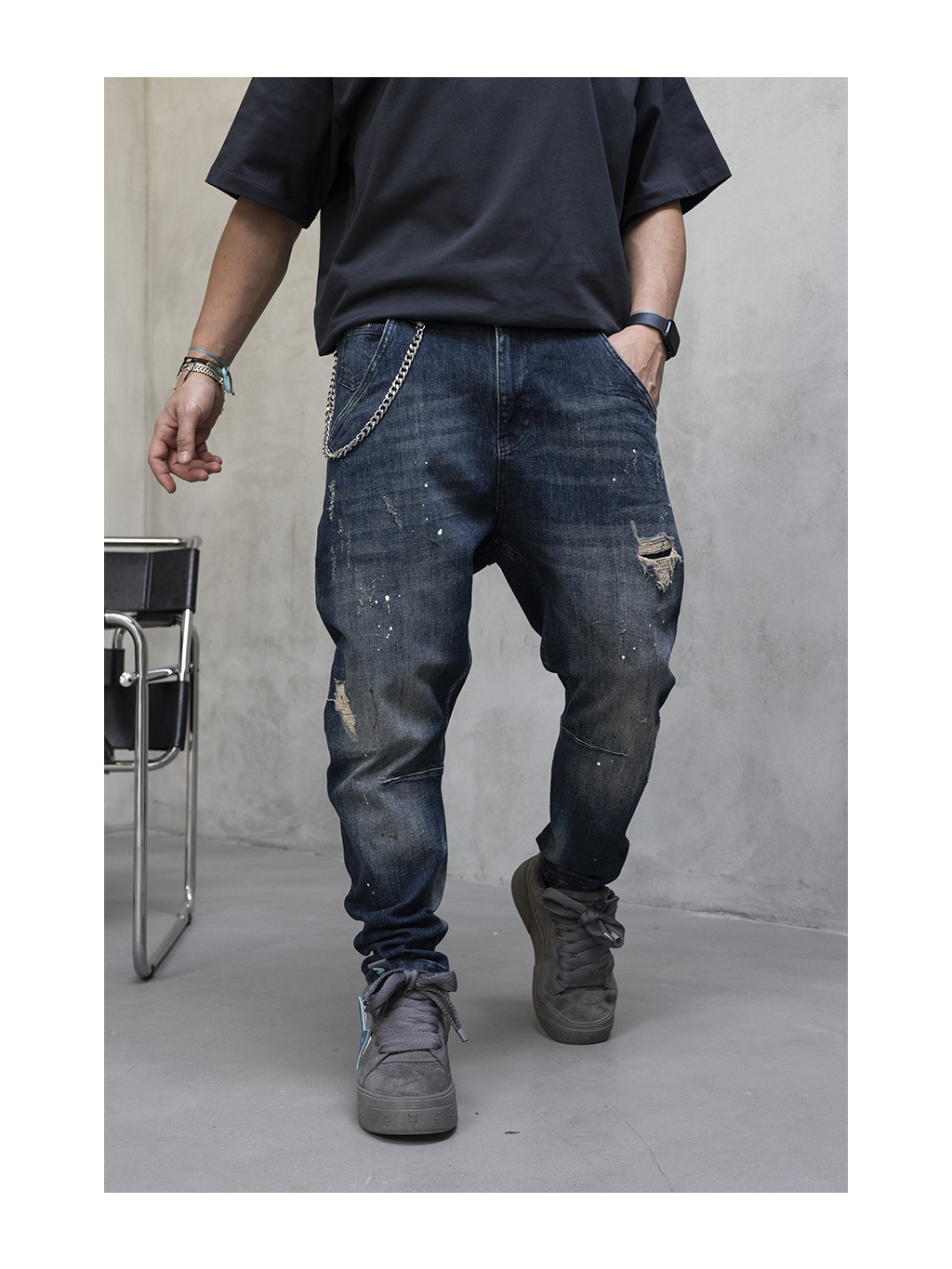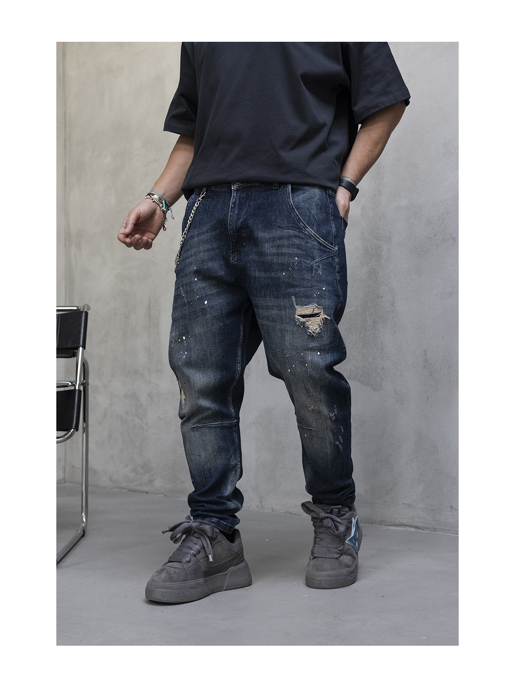 Tieto tmavomodré rifle sú navrhnuté v uvoľnenom loose fit strihu, ktorý poskytuje dostatok priestoru v oblasti stehien aj nohavíc a zabezpečuje maximálne pohodlie pri každodennom nosení. Voľnejšia silueta a prirodzený tvar nohavíc podčiarkujú moderný streetwearový charakter modelu.