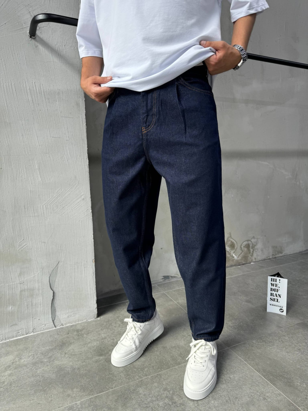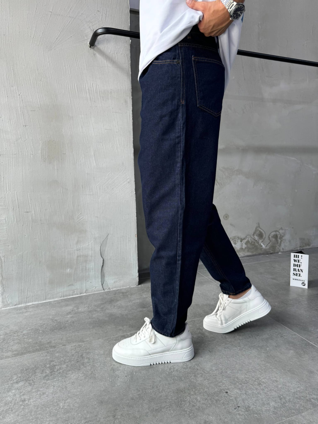 Pánske modré rifle s relaxed balónovým strihom – moderná silueta s dôrazom na pohodlie a čistý streetwearový štýl.