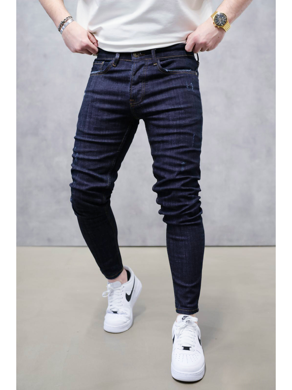 Tmavomodré skinny fit rifle s čistým vzhľadom a jemným spraním pre nadčasový, elegantný streetwear štýl.