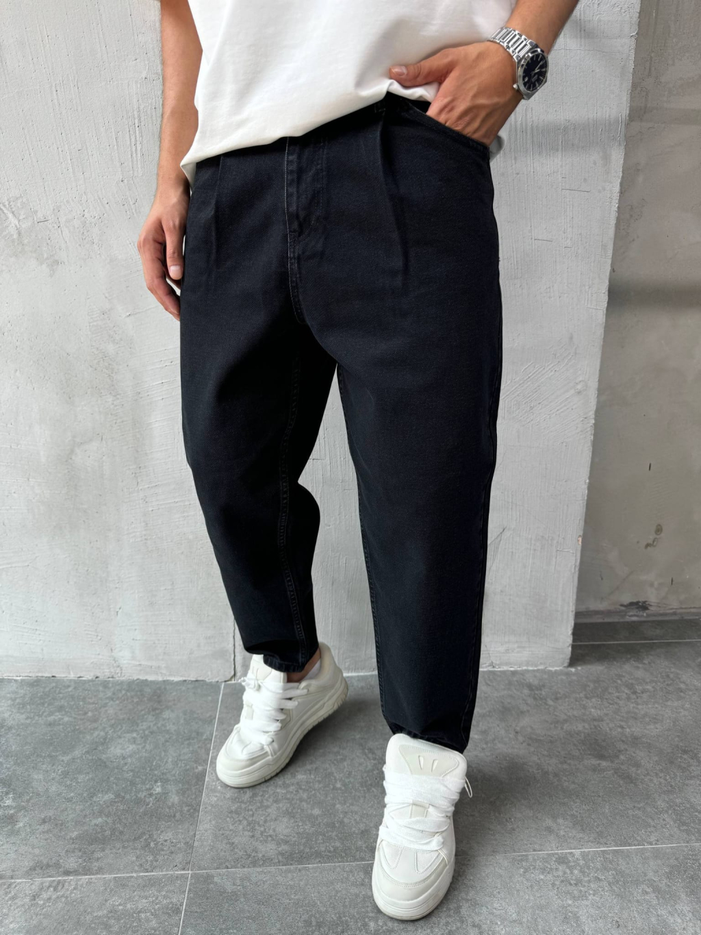 Tieto pánske rifle v čiernej farbe zaujmú svojím balónovým relaxed strihom, ktorý je voľnejší v oblasti stehien a postupne sa jemne zužuje smerom ku členkom. Vďaka tomu vytvárajú modernú siluetu inšpirovanú súčasnými street a minimalistickými trendmi, bez toho, aby pôsobili prehnane objemne.