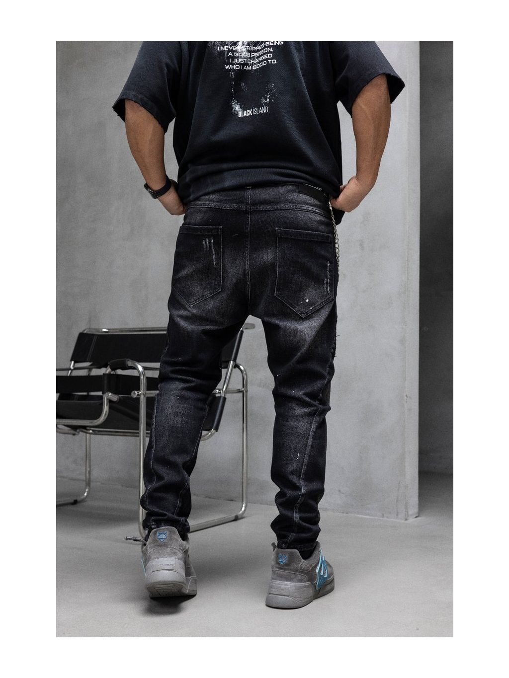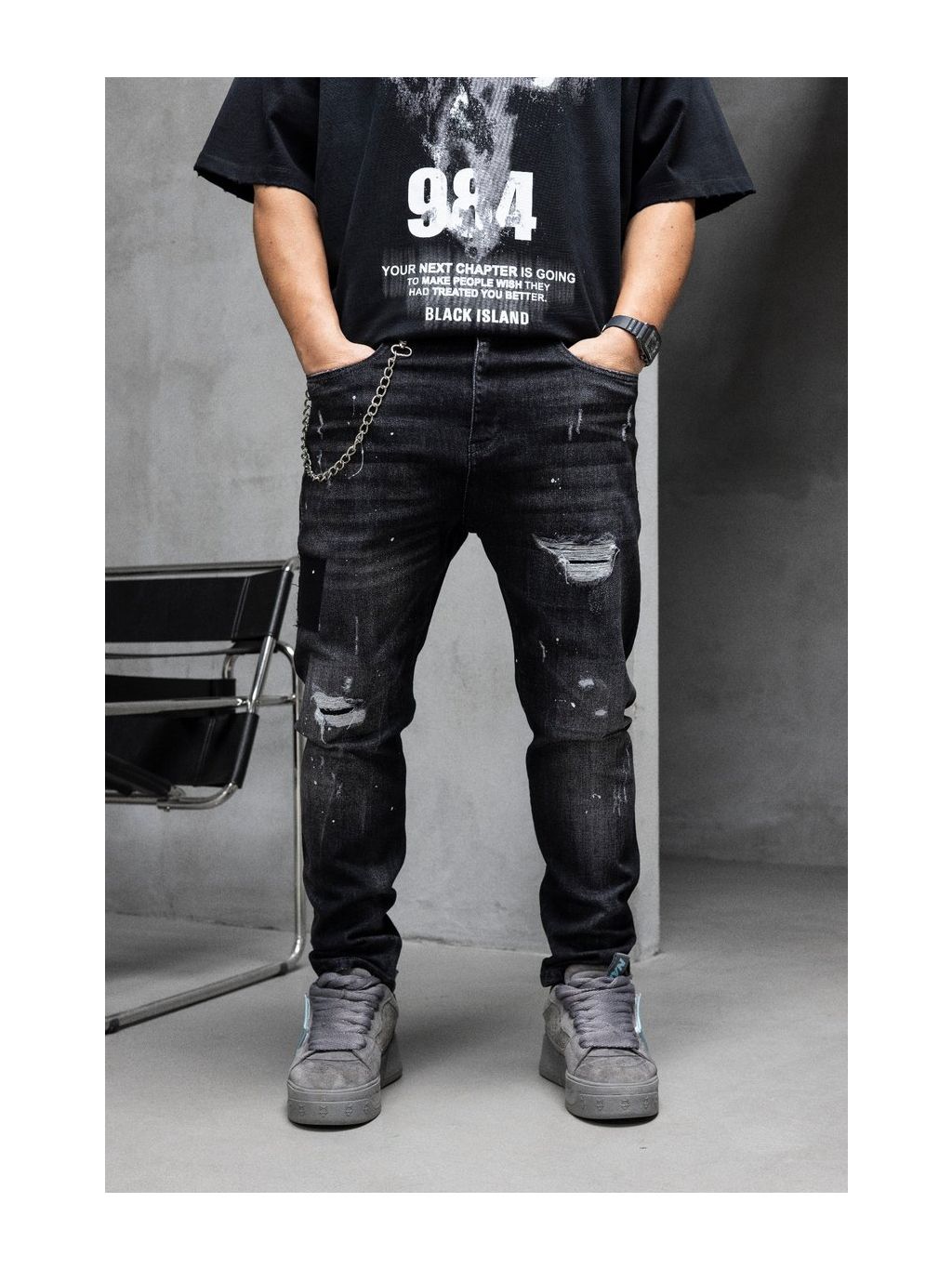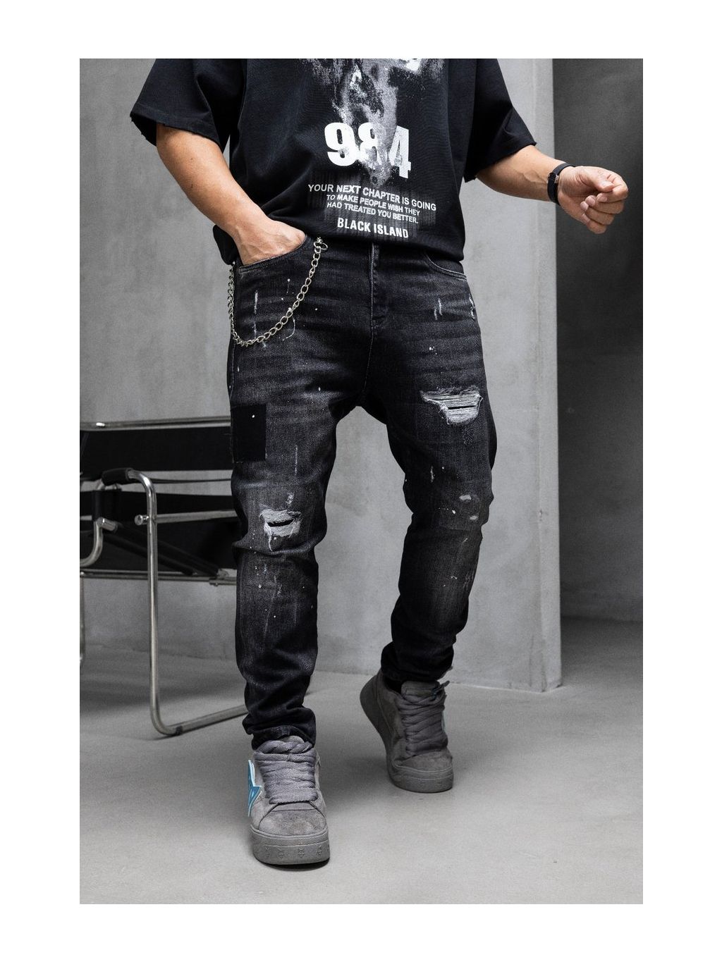 Čierne tapered fit rifle s opraním, trhanými detailmi a retiazkou pre výrazný streetwear štýl.