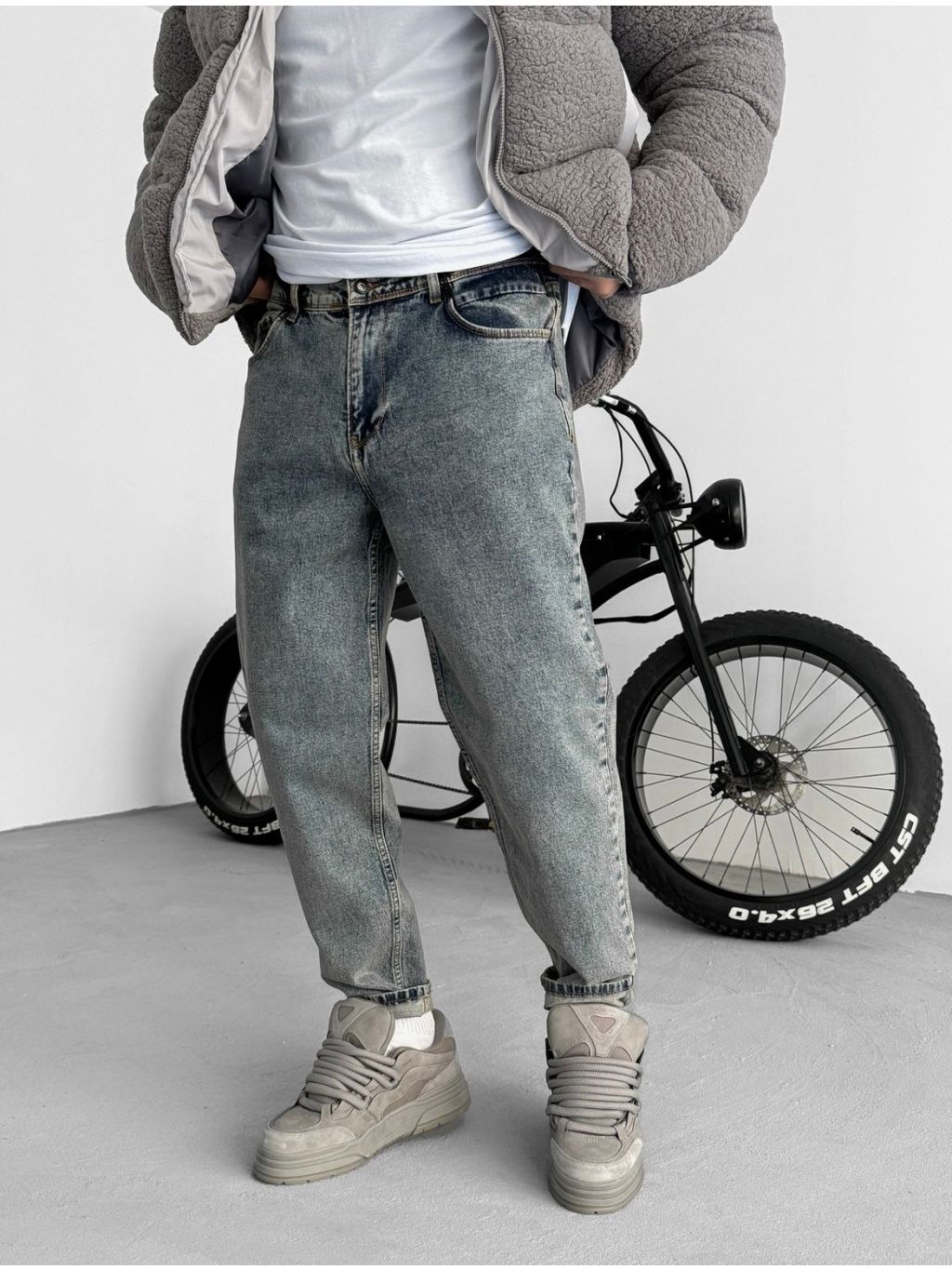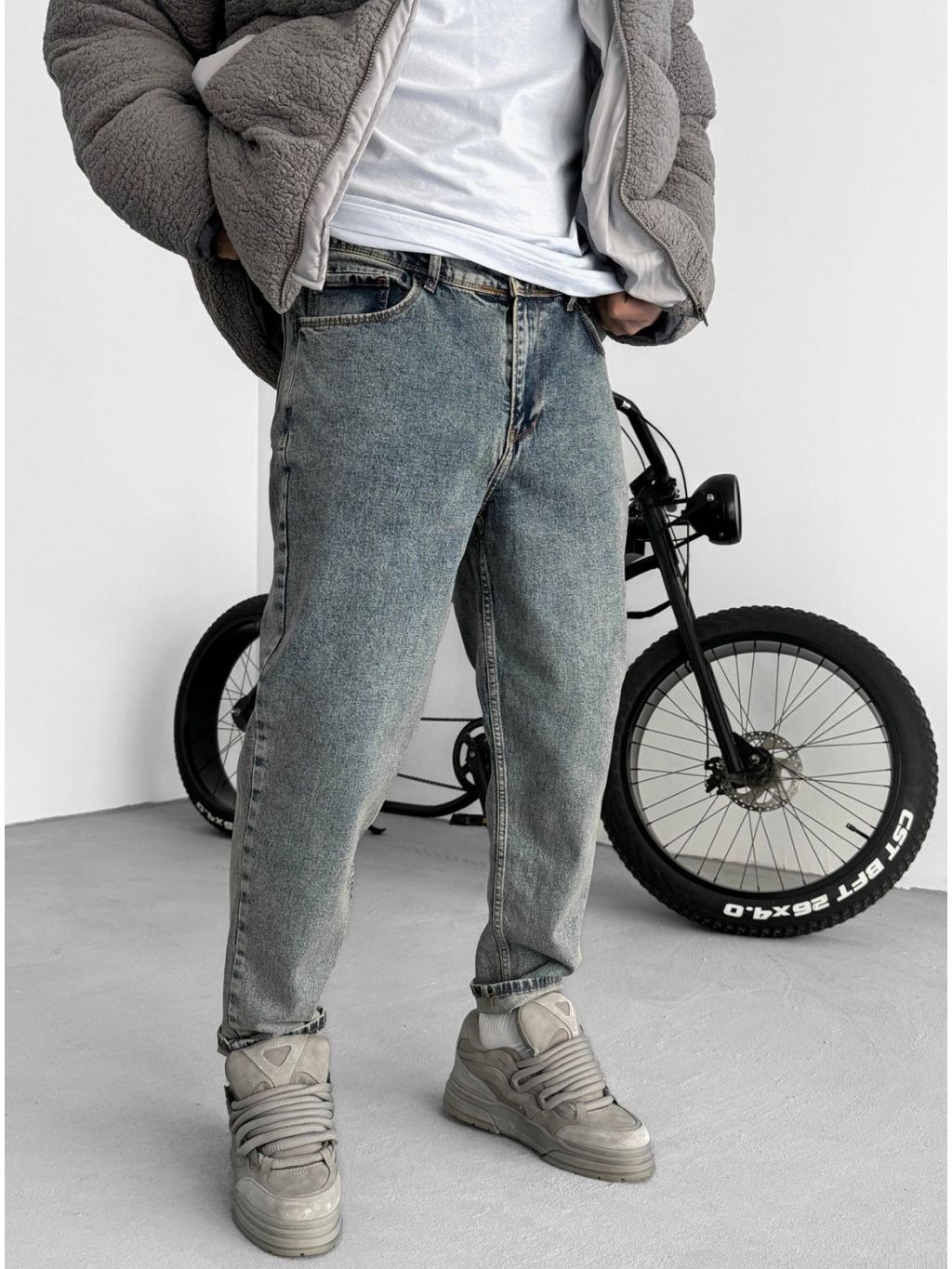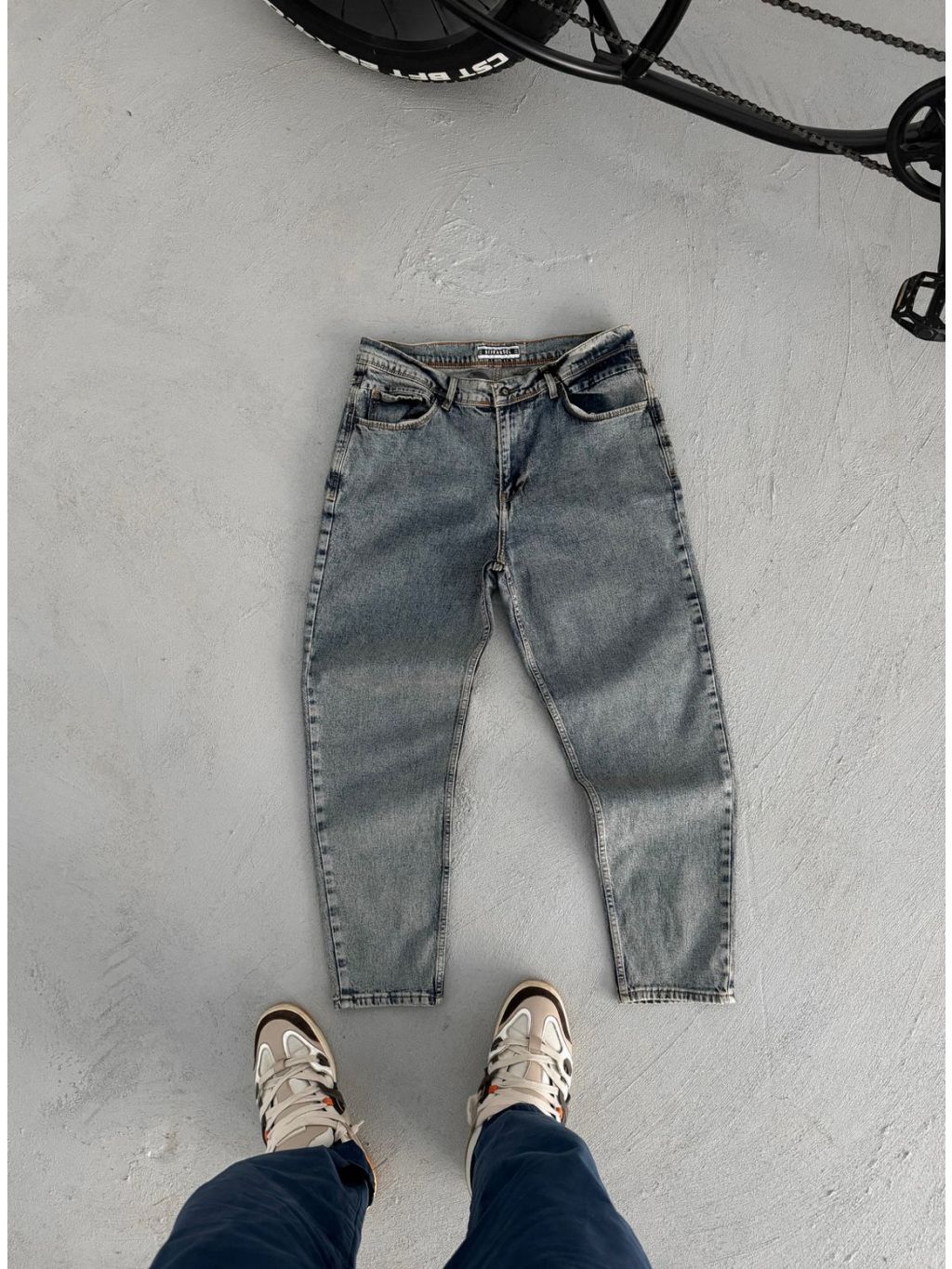 Šedo-modré rifle s vintage wash efektom v modernom banan strihu.